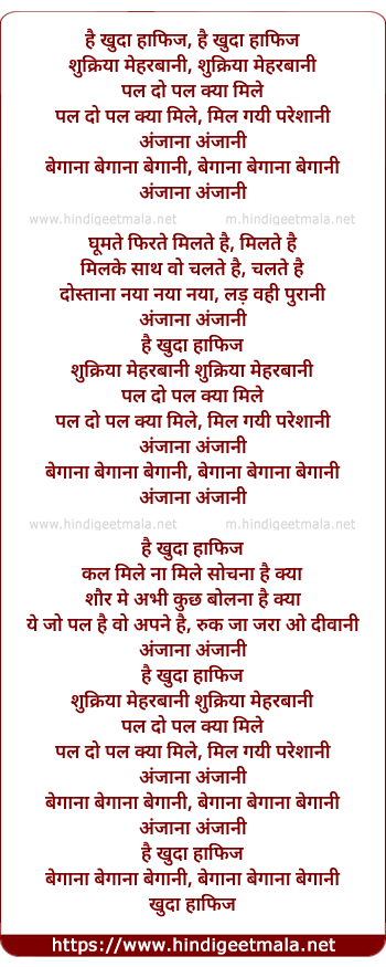 Lyrics of Khuda Hafiz Shukariya Meharbani - खुदा हाफिज शुक्रिया मेहरबानी
