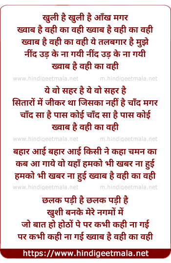 Lyrics of Khuli Hai Ankh Magar Khwab Hai Wahi - खुली है आँख मगर ख्वाब है वही