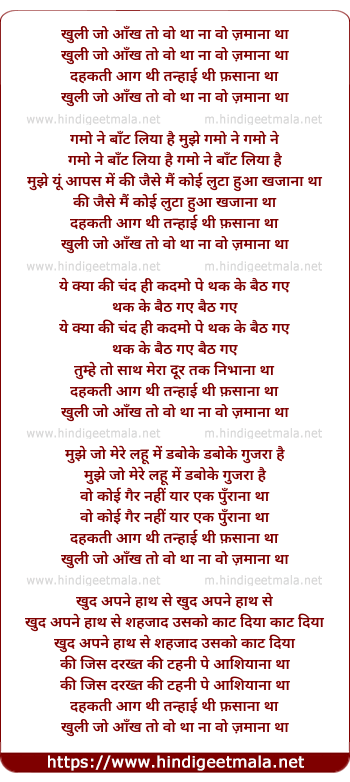 Lyrics of Khuli Jo Aankh To Vo Tha Na Vo Zamana Tha - खुली जो आँख तो वो था ना वो ज़माना था