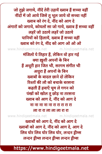 khwab ko khab ko rag de, nind ko aag de, aag de