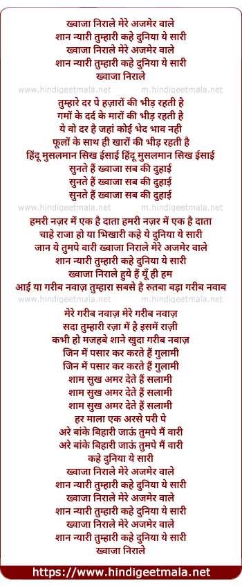 Lyrics of Khwaja Nirale Mere Ajmer Wale Shaan Nayari Tumhari - ख्वाजा निराले मेरे अजमेर वाले शान न्यारी तुम्हारी