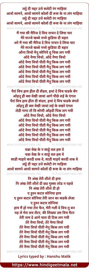 Lyrics of Odhe Naina Vichon Peeti Mainu Kick Lag Gayi - ओदे नैणा विचो पीती मैनू किक लग गयी