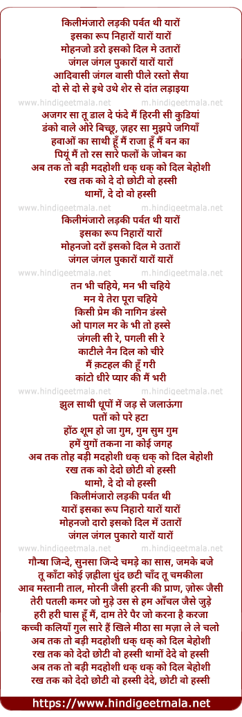 Lyrics of Kilimanjaro Ladki Parvat Thi Yaaro - किलीमंजारो लड़की पर्वत थी यारों