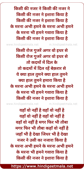 Lyrics of Kisi Ki Nazar Ne Ishara Kiya Hai, Ki Marne Hum Ne Gavara Kiya Hai - किसी की नजर ने इशारा किया है, की मरने हम ने गवारा किया है