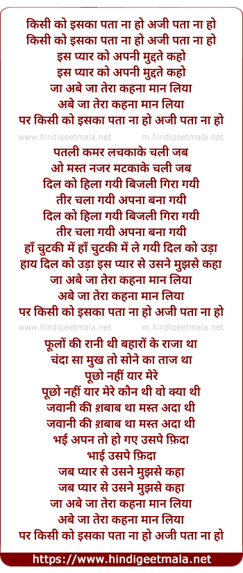 Lyrics of Kisi Ko Iska Pata Na Ho (2) - किसी को इसका पता ना हो अजी पता ना हो