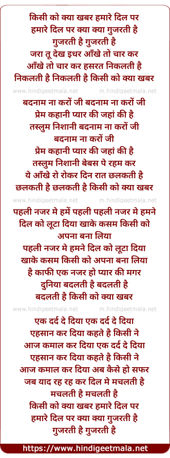 Lyrics of Kisi Ko Kya Khabar Hamare Dil Par - किसी को क्या खबर हमारे दिल पर