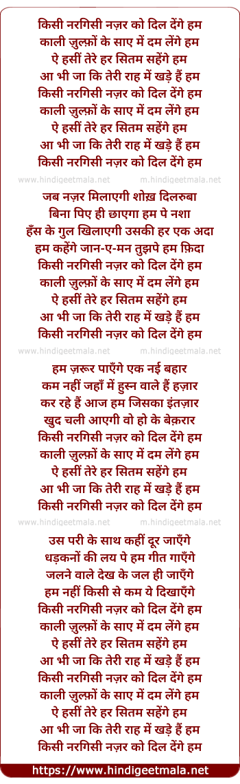 Lyrics of Kisi Nargisi Nazar Ko Dil Denge Hum - किसी नरगिसी नज़र को दिल देंगे हम