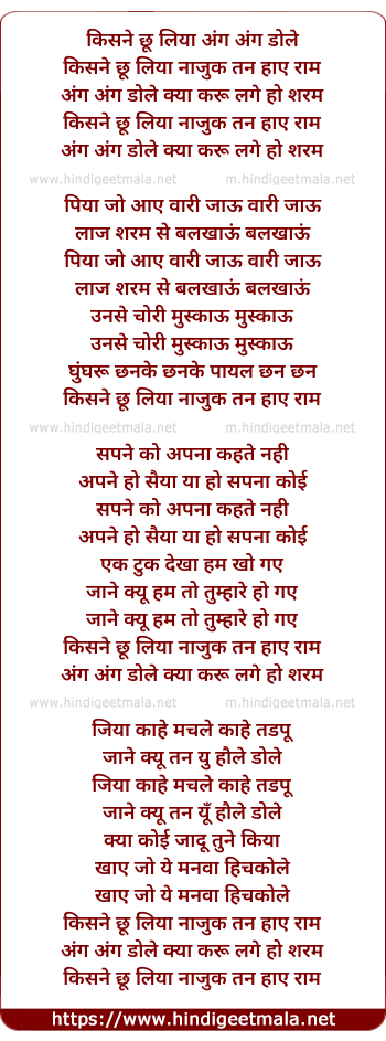 Lyrics of Kisne Chhu Liya Nazuk Tan Haye - किसने छू लिया नाजुक तन हाए