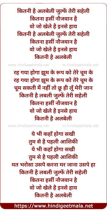 Lyrics of Kitni Hai Albeli Zulfe Teri Saheli, Kitna Hasin Naujawaan Hai - कितनी है अलबेली जुल्फें तेरी सहेली, कितना हसीं नौजवान है