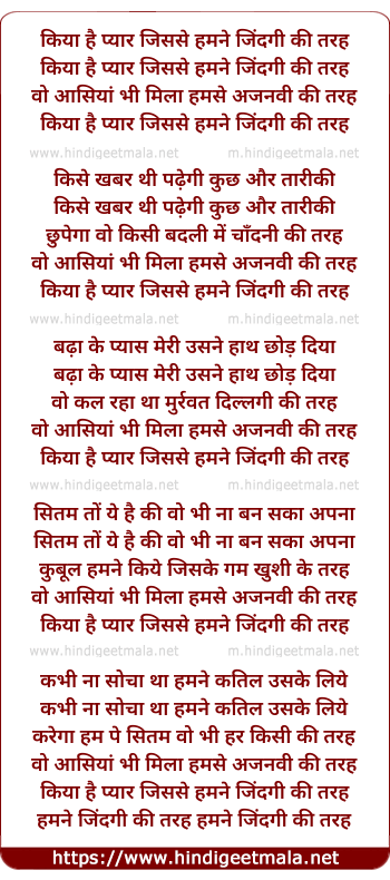 Lyrics of Kiya Hai Pyar Jisse Hamne - किया है प्यार जिससे हमने जिंदगी की तरह
