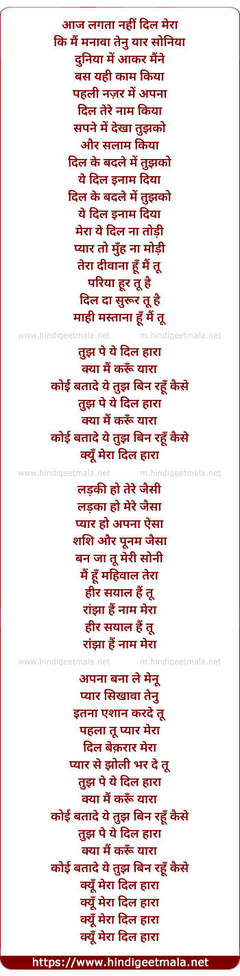 Lyrics of Kiyu Mera Dil Hara - आज लगता नहीं दिल मेरा
