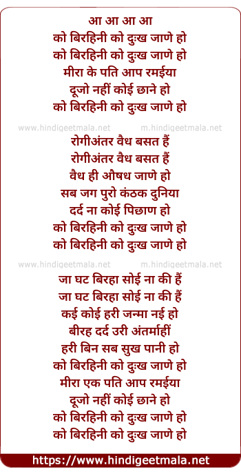 Lyrics of Ko Birahini Ko Dukh Jane Ho - को बिरहिनी को दुःख जाणे हो