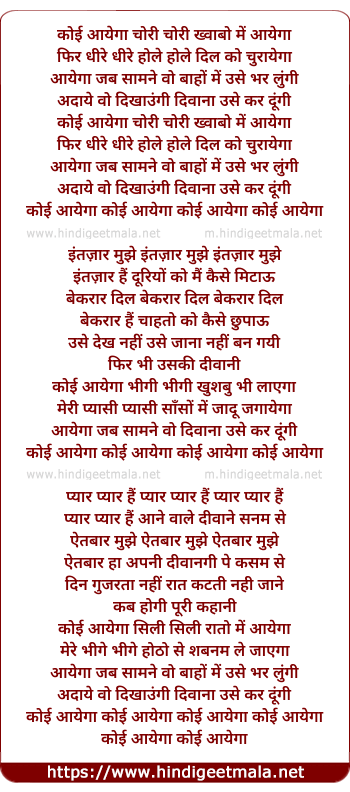 Lyrics of Koi Ayega Chori Chori Khwabo Me - कोई आयेगा चोरी चोरी ख्वाबो में
