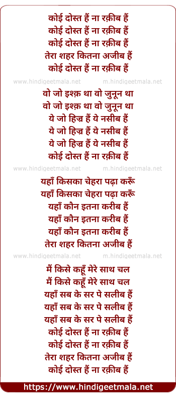 Lyrics of Koi Dost Hai Na Raqib Hai - कोई दोस्त हैं ना रक़ीब हैं