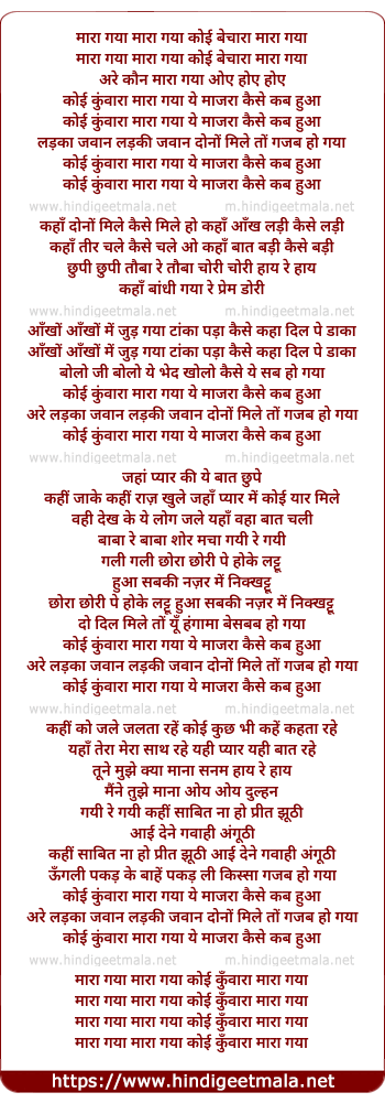 Lyrics of Koi Kunwara Mara Gaya - कोई कुंवारा मारा गया