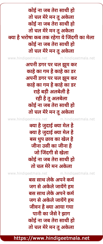 Lyrics of Koi Na Jab Tera Sathi Ho To Chal Mere Man Tu Akela - कोई ना जब तेरा साथी हो तो चल मेरे मन तू अकेला