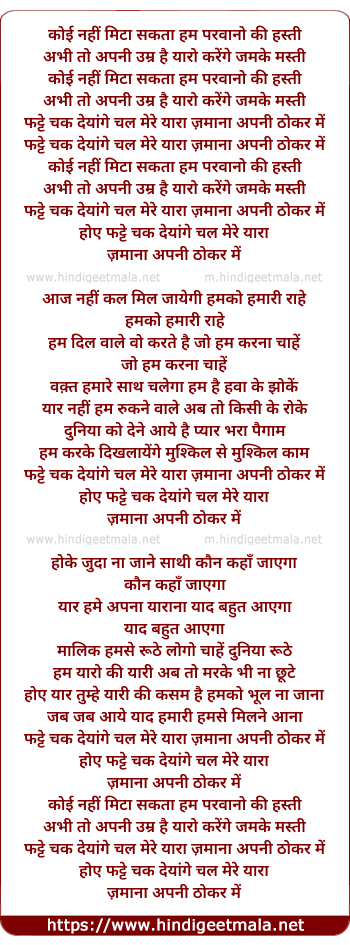 Lyrics of Koi Nahi Mita Sakta Hum Parwano Ki Hasti - कोई नहीं मिटा सकता हम परवानो की हस्ती