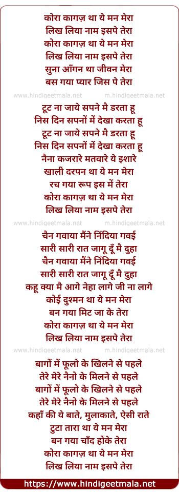 Lyrics of Kora Kagaz Tha Yeh Man Mera - कोरा कागज़ था ये मन मेरा