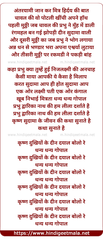 Lyrics of Krishna Sudama (Part-1) - अंतरयामी जान कर मित्र हिर्दय की बात