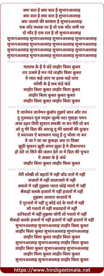 Lyrics of Kya Baat Hai Subhan Allah - क्या बात है सुभानअल्लाह