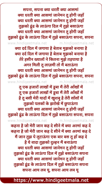 Lyrics of Kya Dharti Kya Aasman Janeman Tu Hogi Jahan - क्या धरती क्या आसमां जानेमन तू होगी जहाँ