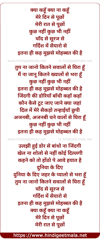 Lyrics of Kyaa Kahu Kyaa Naa Kahu, Mere Din Se Puchho Meri Raat Se Puchho - क्या कहूँ क्या ना कहूँ, मेरे दिन से पूछो मेरी रात से पूछो