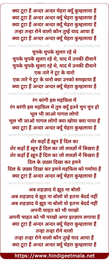 Lyrics of Kya Tuta Hai Andar Andar - क्या टूटा हैं अन्दर अन्दर चेहरा क्यूँ कुम्हलाया हैं