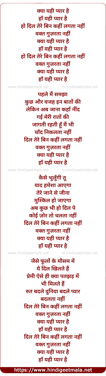 Lyrics of Kyaa Yahi Pyaar Hai, Haan Yahi Pyaar Hai - क्या यही प्यार है