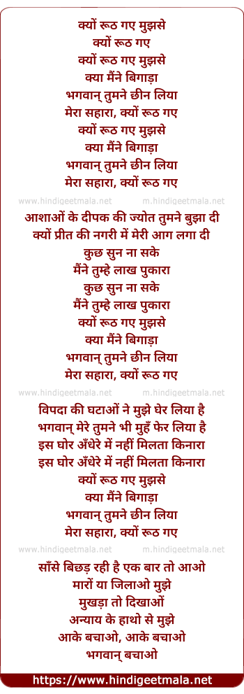 Lyrics of Kyu Ruth Gaye Mujhse - क्यों रूठ गये मुझसे