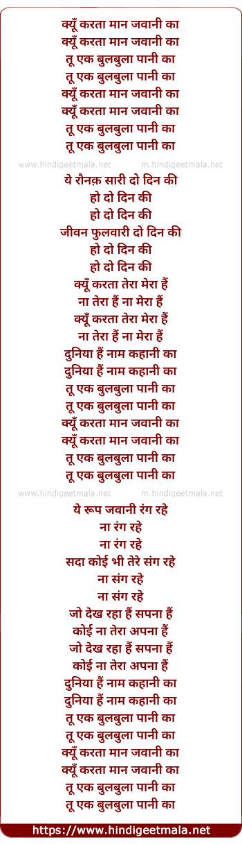 Lyrics of Kyun Karta Man Jawani Ka - क्यूँ करता मान जवानी का