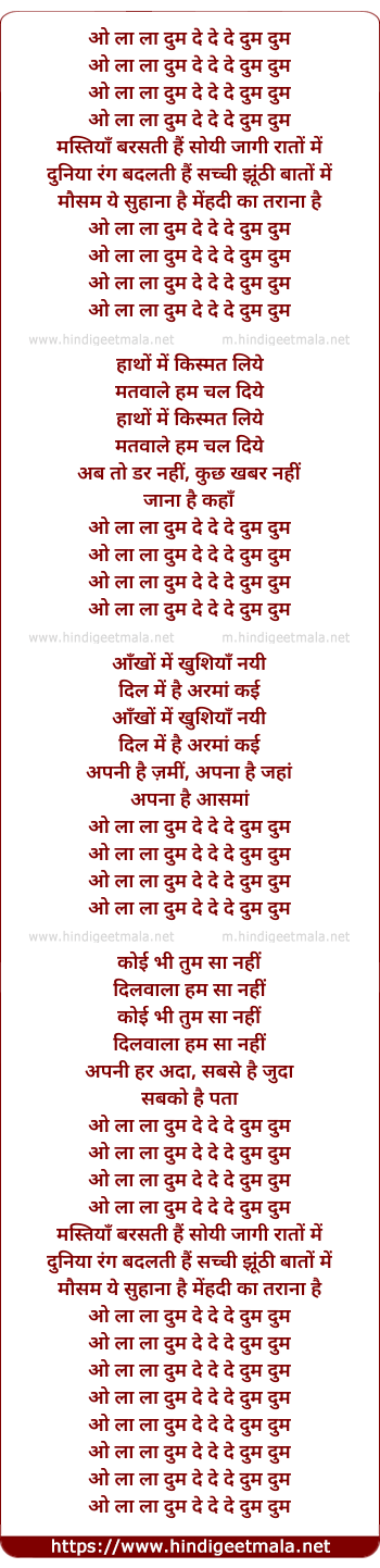 Lyrics of La La Dam - ओ ला ला दुम दे दे दे दुम दुम