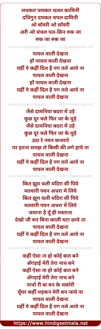 Lyrics of Lachkat Chamkat, Payal Vali Dekhna Yahi Pe Kahi Dil Hai - लचकत चमकत, पायल वाली देखना यही पे कही दिल है