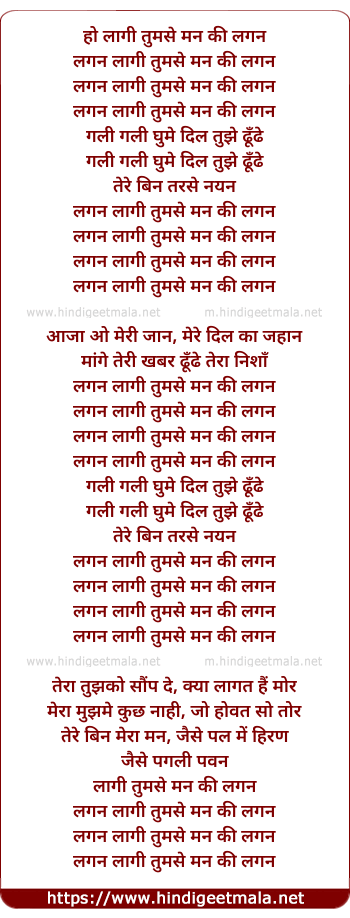 Lyrics of Lagan Laagi Tumse - हो लागी तुमसे मन की लगन