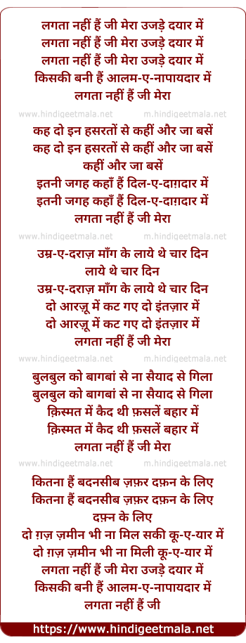 Lyrics of Lagataa Nahin Hai Ji Meraa Ujade Dayaar Men - लगता नहीं हैं जी मेरा उजड़े दयार में