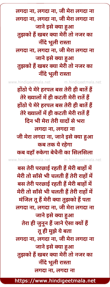 Lyrics of Lagdaa Na, Lagdaa Na, Jee Mera Lagdaa Na - लगदा ना, लगदा ना, जी मेरा लगदा ना