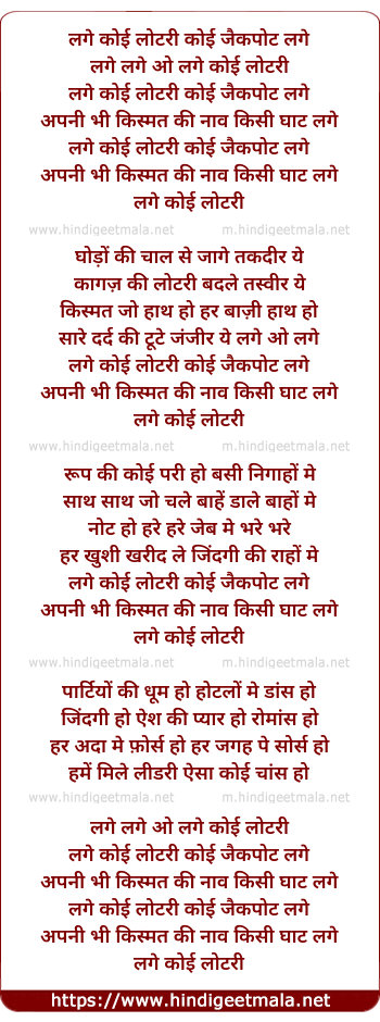 Lyrics of Lage Koi Lottery Koi Jackpot Lage, Apni Bhi Kismat Ki Naav Kisi Ghaat Lage - लगे कोई लोटरी कोई जैकपोट लगे, अपनी भी किस्मत की नाव किसी घाट लगे