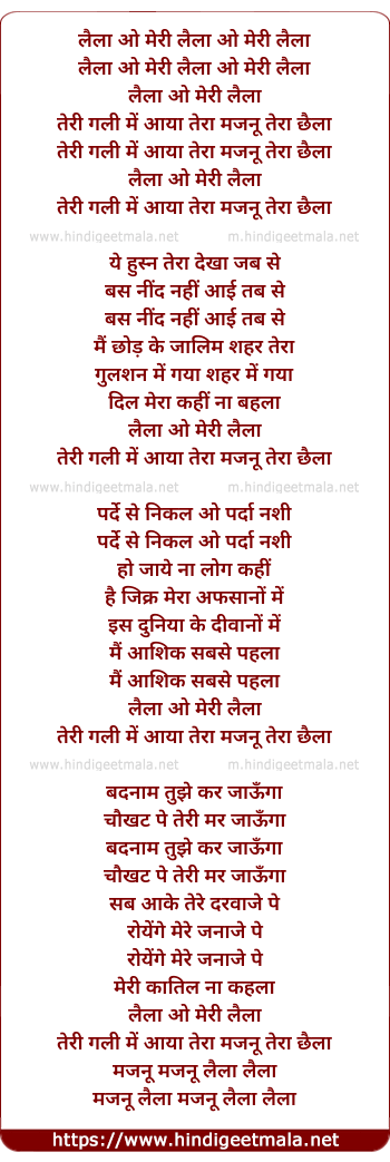 Lyrics of Laila O Meri Laila, Teri Gali Me Aaya Tera Majnu Tera Chhaila - लैला ओ मेरी लैला, तेरी गली में आया तेरा मजनूं तेरा छैला