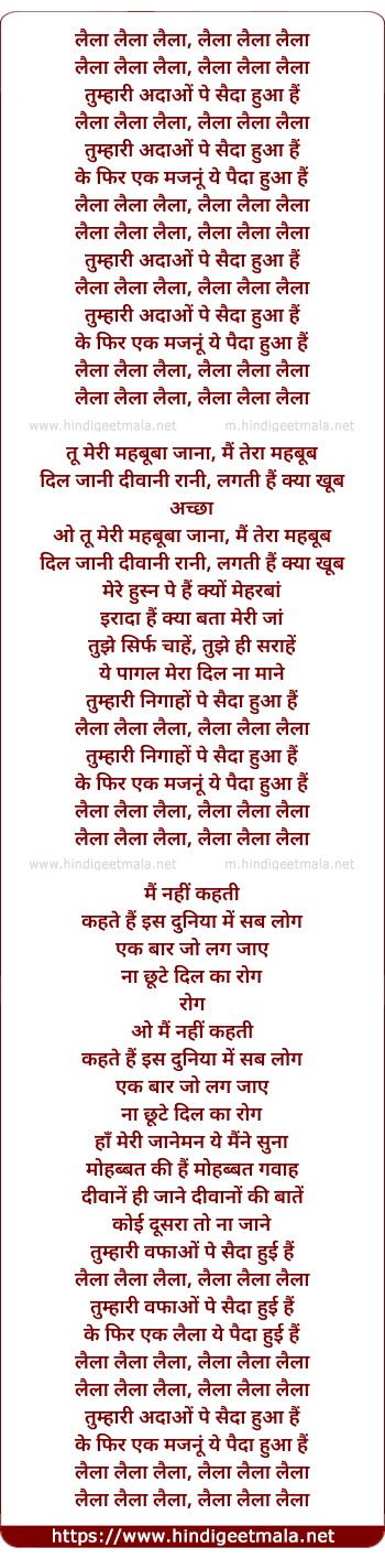 Lyrics of Lailaa Lailaa (Zameer) - लैला लैला लैला, लैला लैला लैला