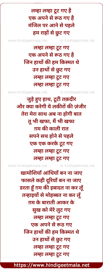 Lyrics of Lamha Lamha Tut Gaye Hai - लम्हा लम्हा टूट गए है