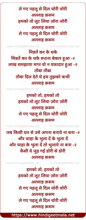 Lyrics of Le Gaye Pehlu Se - ले गए पहलू से दिल चोरी चोरी