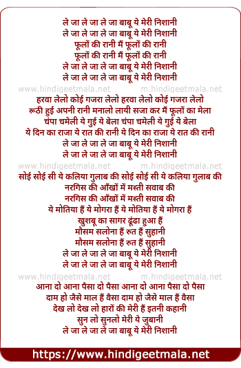 Lyrics of Le Ja Le Ja Babu Ye Meri Nishani - ले जा ले जा बाबू ये मेरी निशानी