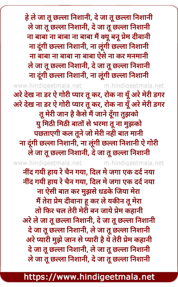 Lyrics of Le Jaa Tu Chhalla Nishani De Ja Tu Chhalla Nishani - ले जा तू छल्ला निशानी दे जा तू छल्ला निशानी