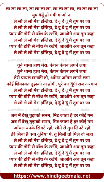 Lyrics of Le Lo Le Lo Mera Imtihaan - ले लो ले लो मेरा इम्तिहां