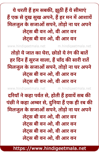 Lyrics of Lets Be One ( Hindi) - ये धरती हैं हम सबकी, झूठी हैं ये सीमाएं