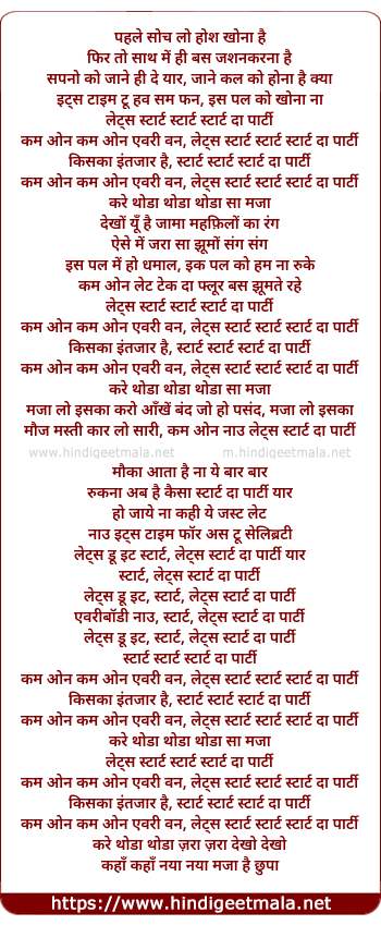 Poetic Translation - Lyrics of Lets Start Start Start The Party - लेट्स स्टार्ट स्टार्ट स्टार्ट दा पार्टी