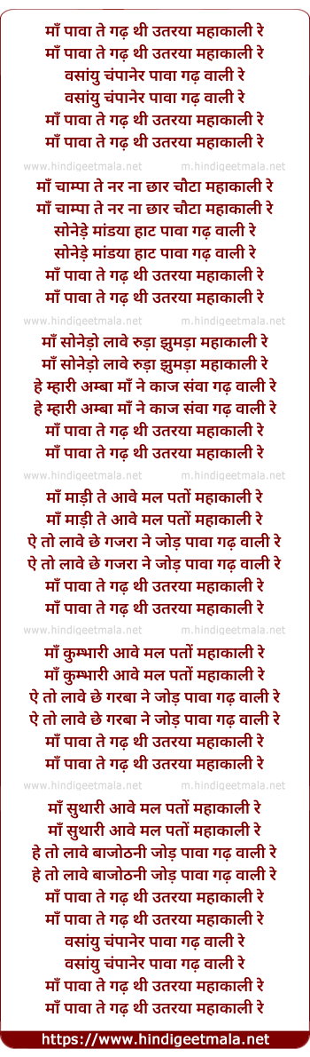 Lyrics of Ma Pava Te Gadh Thee Utarya Mahakalee Re - माँ पावा ते गढ़ थी उतरया महाकाली रे