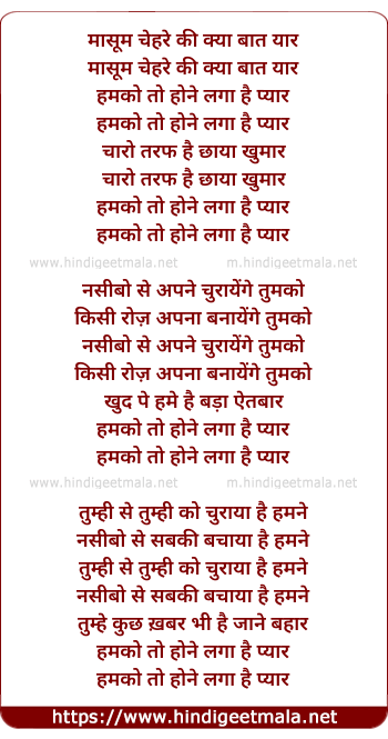 Lyrics of Maasum Chehare Ki, Hamako To Hone Lagaa Hai Pyaar - मासूम चेहरे की, हमको तो होने लगा है प्यार