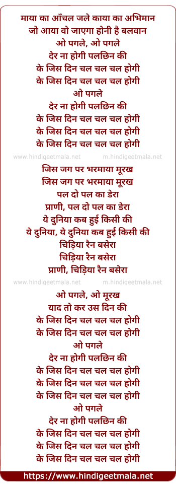 Lyrics of Maya Ka Aanchal Jale Kaya Ka Abhiman - माया का आँचल जले काया का अभिमान