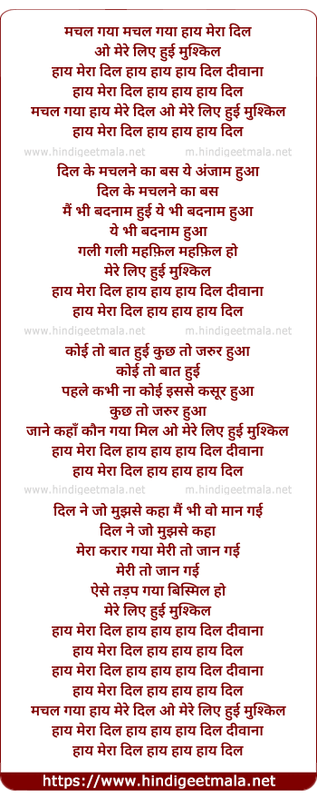 Lyrics of Machal Gaya Haye Mera Dil - मचल गया हाय मेरा दिल