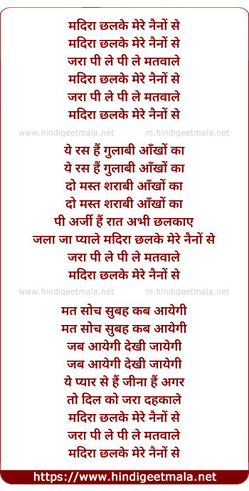Lyrics of Madira Chhalke Mere Naino Se - मदिरा छलके मेरे नैनों से
